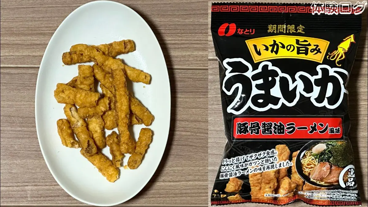 なとり うまいか 豚骨醤油ラーメンは味の濃さが特長のスナック菓子です。
